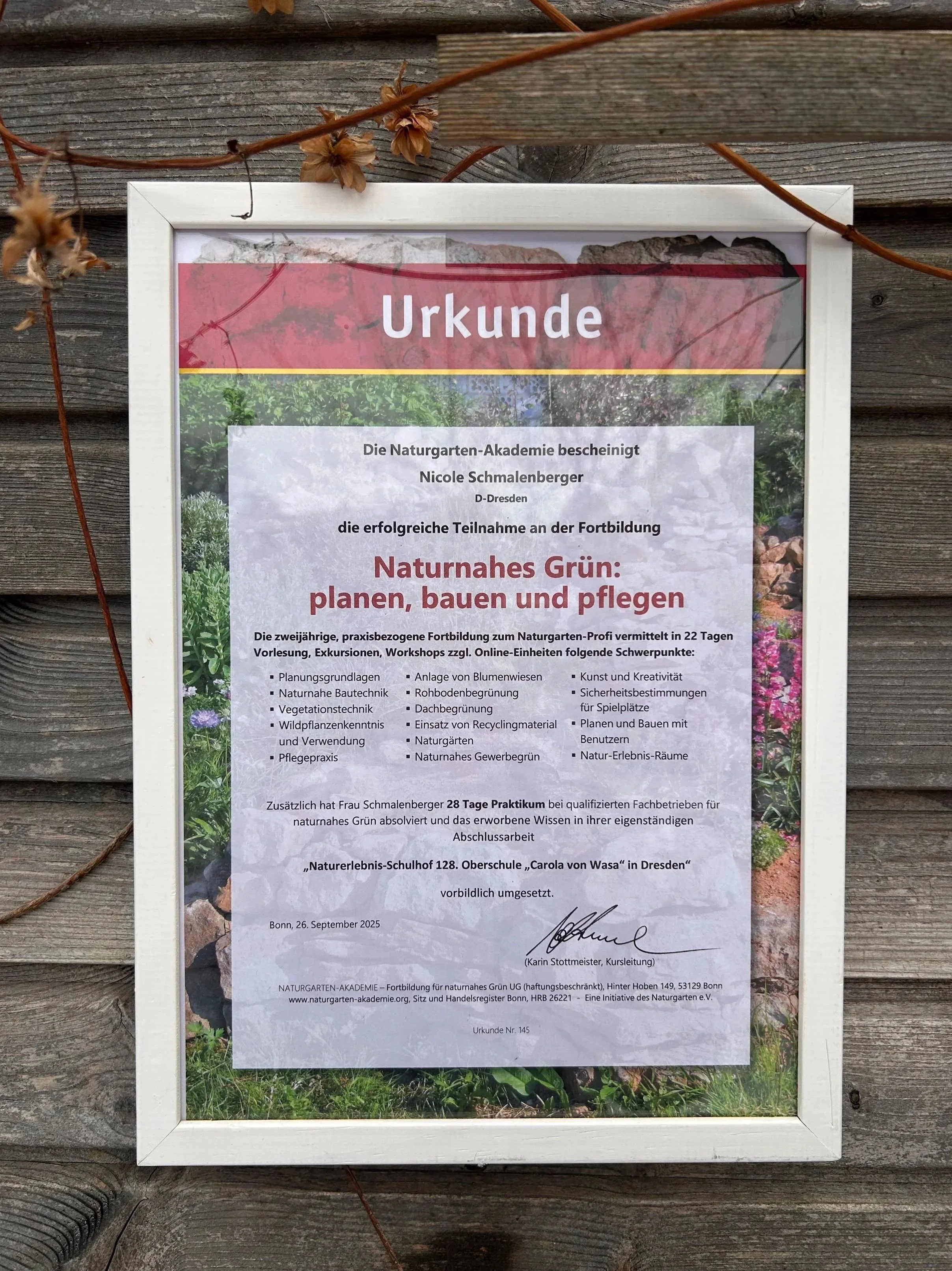 Zwei Jahre später mache ich mich nun auf den Weg und freue mich darauf naturnahe, nachhaltige Grünflächen für Privatpersonen, Kommunen und Unternehmen zu planen und umzusetzen. Artenschutz im Kleinen und gärtnerische Ästhetik schließen sich nicht aus, sondern lassen sich wunderbar verbinden. Lassen Sie uns gemeinsam aufbrechen, ich nehme Sie gerne ein Stück mit!